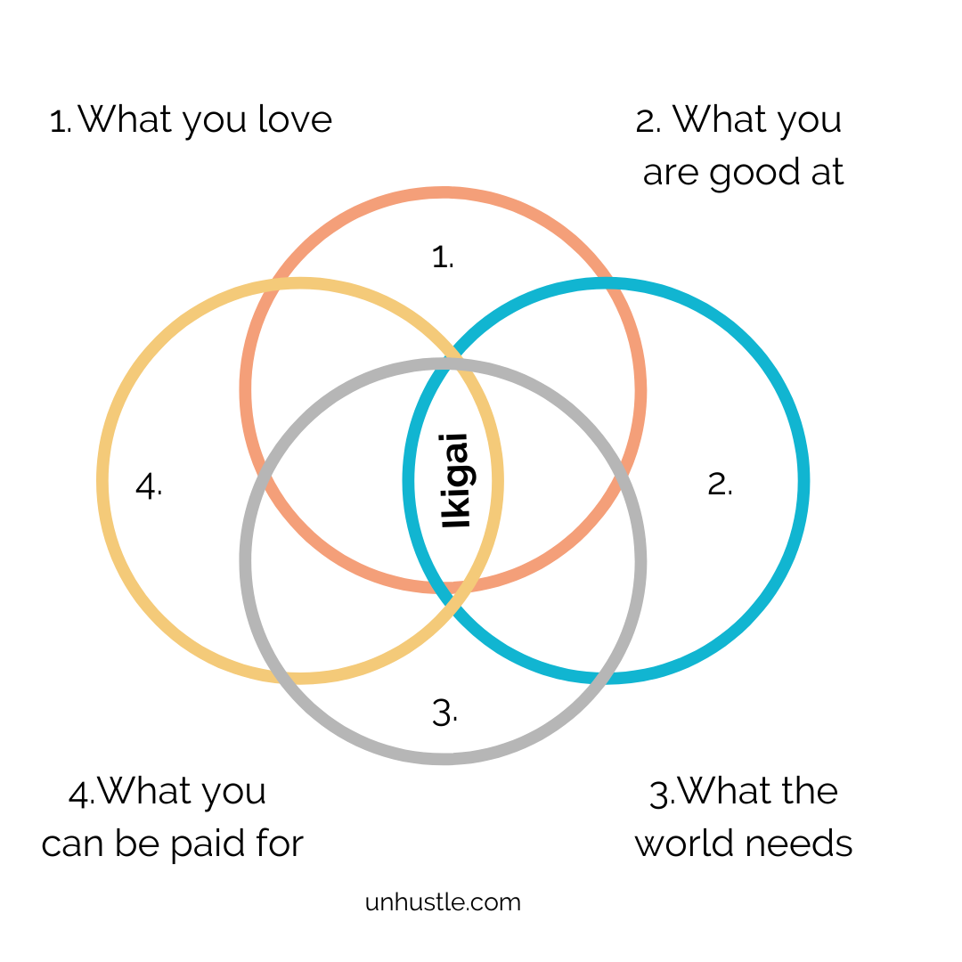 The cross-section of all four circles is your Ikigai. I did this exercise while trying to discover my purpose. This is how I decided to pivot from marketing to starting Unhustle. Having a deeper purpose has increased my well-being, happiness, and fulfillment.
