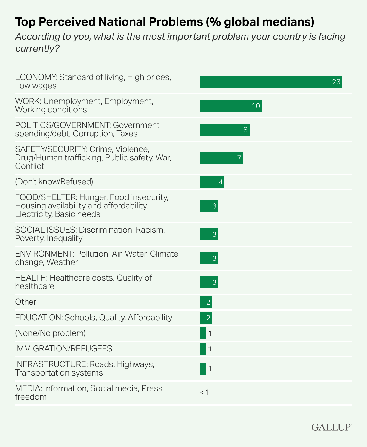 What happened to Garrett isn’t unique to teaching. When Gallup asked people in 107 countries to identify their most important national problem in 2026, work-related issues ranked as the second most common global priority, only after economic uncertainty. Ten percent of the world’s adults name employment concerns—not just unemployment, but the fundamental quality of work itself—as their nation’s biggest challenge.